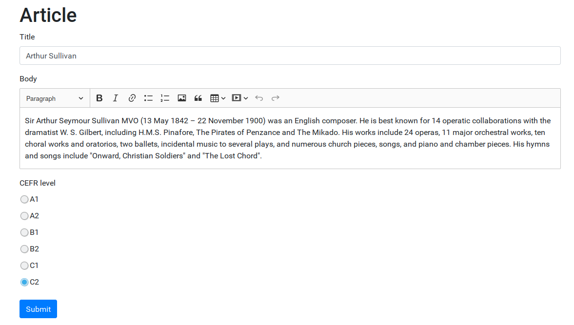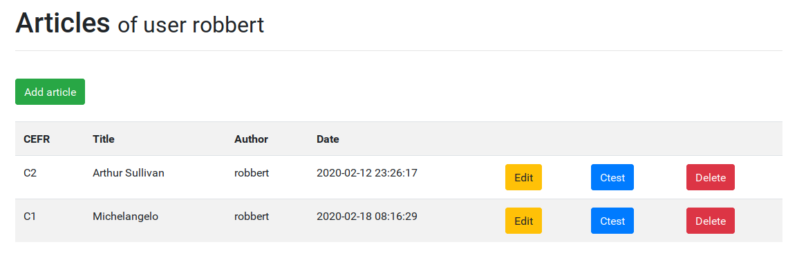 Hence, I started developing the web app using Bootstrap and Flask. The hardest part in building this app was the generation of the C-test based on an article: I had to find a way to render a word at one time, but an input form at another time. At the same time, you have to be able to get the user input back out of these input forms. This problem was eventually resolved by making some custom form classes that had an extra boolean attribute, which could be used in the rendering template. You also don’t know beforehand how many words or input fields there are going to be, so you have to dynamically add attributes to the class that holds your words and input fields. After getting to know python’s setattr method, this was resolved as well.