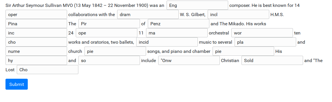 With Teach the Teachers, one of the problems that we have every year is that we need to divide the new teachers into groups, according to their level of English. We wanted to use a platform like EFSET, but, with some of the teachers’ limited set of IT skills, the process of creating an account and accessing the right test turned out to be too difficult. That’s why we wanted to create our own, very simple web app to test the teachers’ level of English. One of the members in our advisory board proposed the so-called “C-test”, where you leave the last parts of some words out, and it’s up to the testee to fill these in.