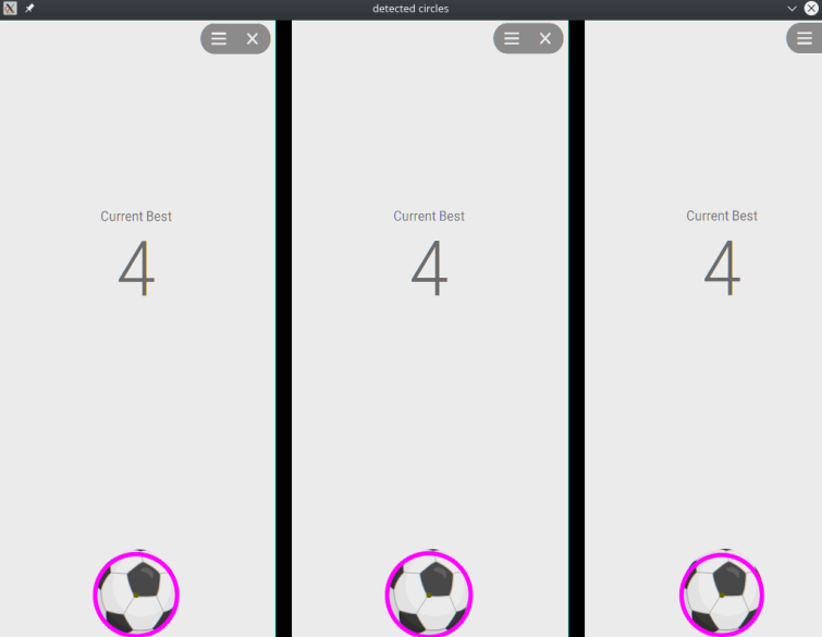 The next challenge was to figure out how to convert an ffmpeg AVFrame to an OpenCV mat. Basically, not everyone uses the same conventions as to how a picture is defined, and I needed OpenCV to understand the one used in scrcpy. I never really succeeded in doing so, but at some point, I succeeded to get 3 times the same picture, horizontally adjacent to each other (something tells me these are the R, G and B channel of the picture). I don’t care too much about these colors since the HoughCircles method uses a GrayScale image anyways, so I just ran the method on that picture and so it would extract the ball 3 times at different coordinates. No problem, we just grab the first circle coordinates, do some hocus pocus with the resolutions of the frame and the phone’s screen, and voila, we know where to tap.